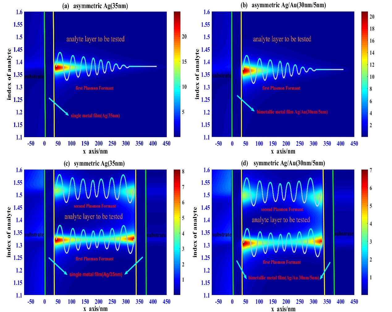 图2 不同金属材料及比例构成的SPR相应电场强度分布图