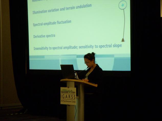 (3)受“IEEE国际地球科学与遥感大会(IGARSS)”的组委会邀请,王春媛老师在第31届温哥华会议上作了题为“A Self-Adjustive Geometric Correction Method for Seriously Oblique Aero Image”的Oral主题报告。