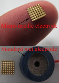 利用MEMS制备工艺研制高散热密度的微通道散热器以及微小干电极。图1为研制的Cu基微通道散热器,可为100W的高功率微小芯片散热,芯片温度控制在75℃以下。图2为研制的微小干电极,曾参加中国国际工业博览会展览,受到上海电视台采访。