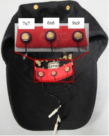图2(a)溅射金的微针干电极以及与传统湿电极大小比较, (b)不同阵列微针干电极安装在棒球帽上
