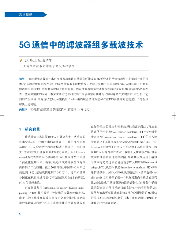 受中国电子学会的邀请,马天鸣老师和他的两名研究生发表了《5G通信中的滤波器组多载波技术》一文,阐述了科研团队的研究方向和最新研究成果,该文章刊登于《中国电子学会会员通讯》2019年第4期第6页~第9页。
